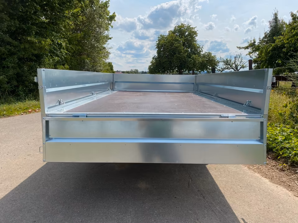Bordwände mit Spannverschlüssen inkl. Zurrpunkte in der Ladefläche. Robuste Siebdruckbodenplatte rutschfest